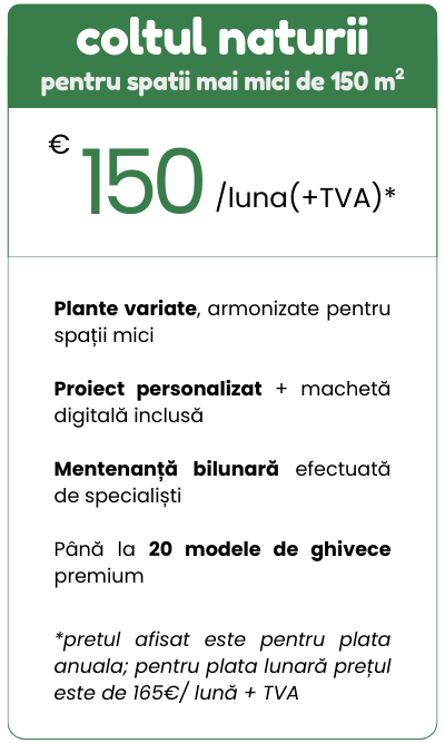 O dată la două săptămâni realizăm mentenanța a plantelor tale: udare, fertilizare, curățare și verificare, iar dacă o plantă nu arată bine, o înlocuim pentru a menține spațiul impecabil.